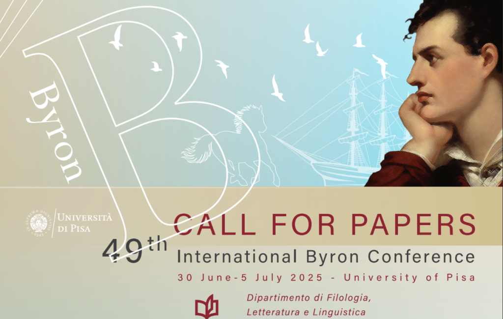 In the year after the poet’s bicentenary, the 2025 International Byron Conference to be held in Pisa (30 June – 5 July 2025) will focus on Byron’s richly inexhaustible legacy from the immediate aftermath of his death to the twenty-first century. The Conference aims to investigate Byron’s ideas about all kinds of futurity – historical, political, personal, and spiritual, among others – as well as the place he and his works have held in culture and literature since 1824, both in Britain and overseas. Byron’s long shadow touches many traditions: this Conference welcomes critical explorations of his legacy in all its transnational and interdisciplinary dimensions.