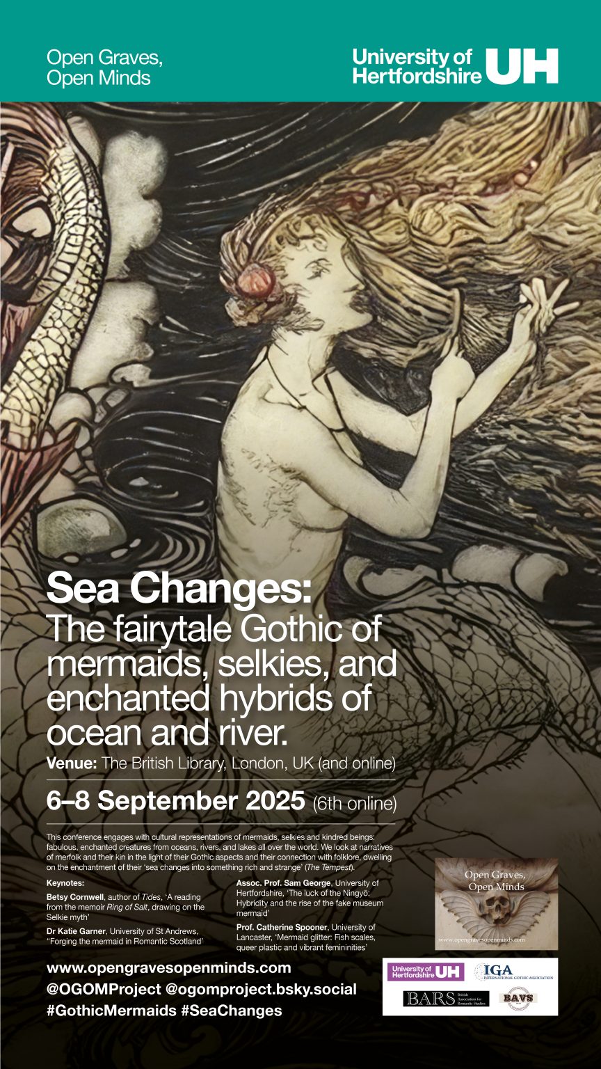 The Open Graves, Open Minds research group’s 3-day conference Sea Changes: The fairytale Gothic of mermaids, selkies, and enchanted hybrids of ocean and river at the British Library and online was a resounding success and an absolute pleasure to attend. It was a truly international affair: delegates came from Australia, Canada, the Czech Republic, Estonia, France, Germany, Greece, Iceland, India, Ireland, Italy, Japan, Mexico, Norway, Poland, Spain, Sweden, Switzerland, Trinidad and Tobago, the UK and the USA. There were a healthy number of doctoral students from the UK and beyond. BARS generously funded the fabulous Sea Changes programme design, Teams backgrounds and posters. This meant the organising committee could release funds for postgraduate tickets. You can view the fantastic design for the illustrated Sea Changes Booklet on the project’s webpages. The printed souvenir posters were popular with delegates and a PDF featured in the online conference packs for those presenting on Teams.